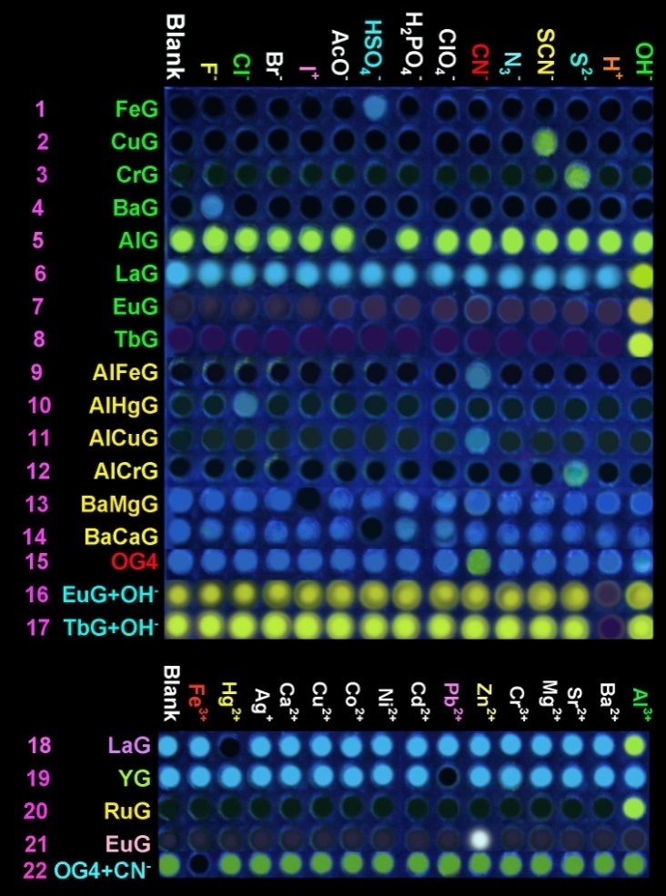 设计合成了新型超分子有机凝胶,通过在该凝胶中引入多重竞争作用,成功的构建了22单元的传感器矩阵。它可以高选择性检测汞离子氰根等14种离子。此外,制备了基于此凝胶的离子响应型荧光显示材料。