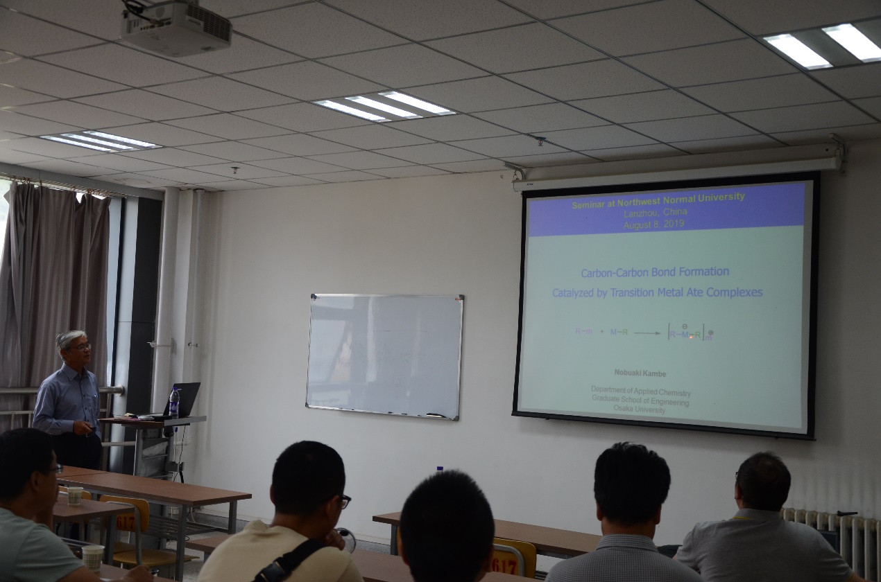 2019年8月8日上午,应德赢vwin体育官网、保水化学功能材料甘肃省国际科技合作基地邀请,日本大阪大学Nobuaki Kambe教授来我校作报告,题为《Carbon-Carbon Bond Formation Catalyzed by Transition Metals Bearing All Carbon Ligands》,德赢vwin体育官网教师、研究生30余人在新校区化学楼E617参加了报告会。报告会由权正军教授主持。