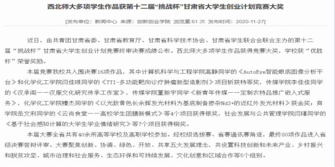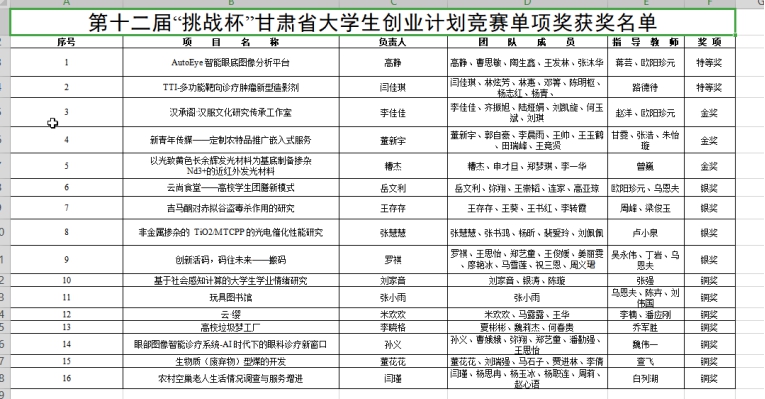 “挑战杯”甘肃省大学生创业计划竞赛由共青团甘肃省委、甘肃省教育厅、甘肃省科学技术协会、甘肃省学生联合会联合主办,竞赛旨在提高广大青年学生的创新创业热情,营造创新创业的良好氛围,是大学生创新创业重要赛事之一。学院培育优秀项目鼓励参加“挑战杯”甘肃省大学生创业计划竞赛,积极开展创新创业相关工作,旨在增强学生创新精神,创业意识和创新创业能力,为同学们搭建了发挥创造潜能、锻炼创新能力、实现创新创业梦想的舞台。