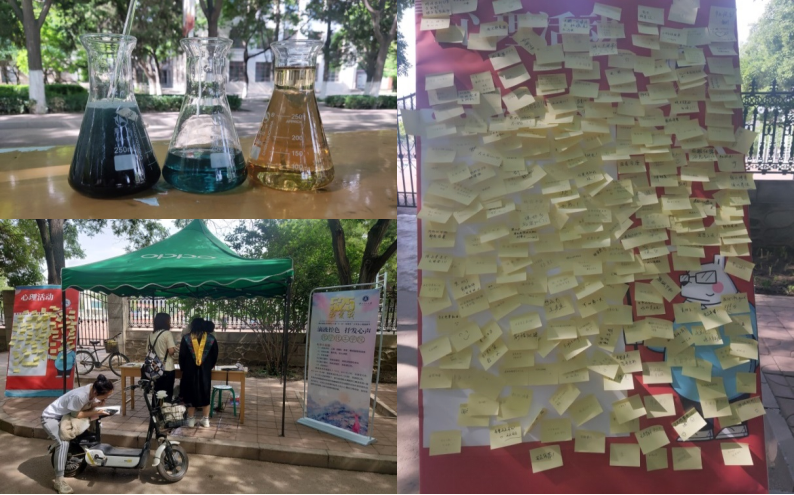 为了让同学们都能走近心理,亲近心理,了解更多的心理学基本知识与心理调节方法,营造校园浓郁的心理健康氛围,5月25日起,德赢于校本部主干道开展心理健康宣传活动,通过做科普小实验,书写心理烦恼以及释放压力游戏等活动,缓解同学们的生活学习以及其他方面压力。在便签上,同学们写下想对亲人、朋友或同学想说的话,写下这一段时间的烦恼,贴在展板上,默默地表达着自己。看到便签的同学,也写下了鼓励和祝福的话。科普小实验则是让同学们小心翼翼、屏心静气地观察着溶液的变化,使同学们获得内心的平静。