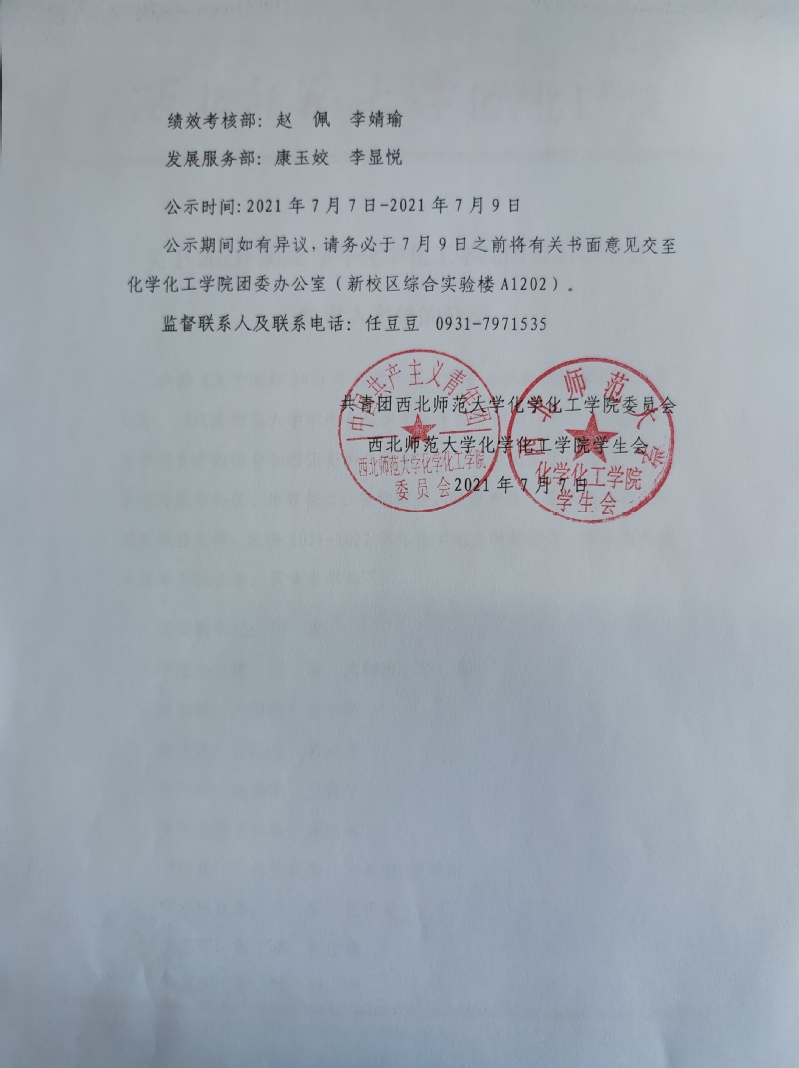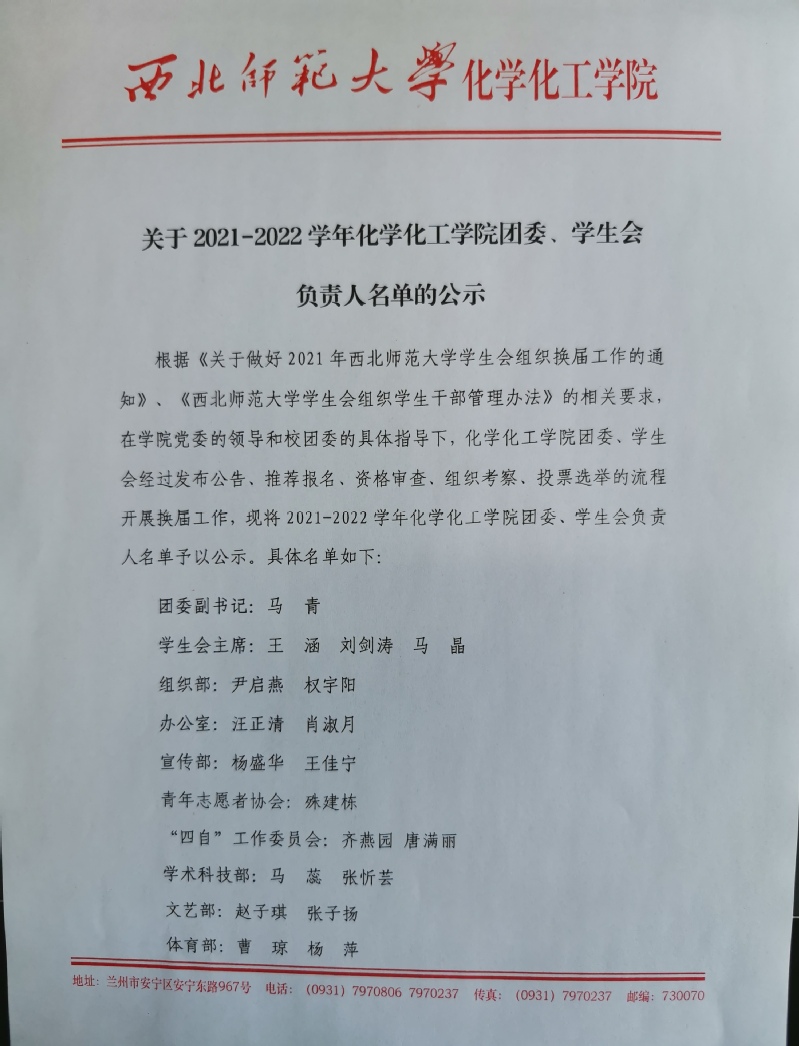 关于2021-2022学年德赢vwin体育官网团委、学生会负责人名单的公示
