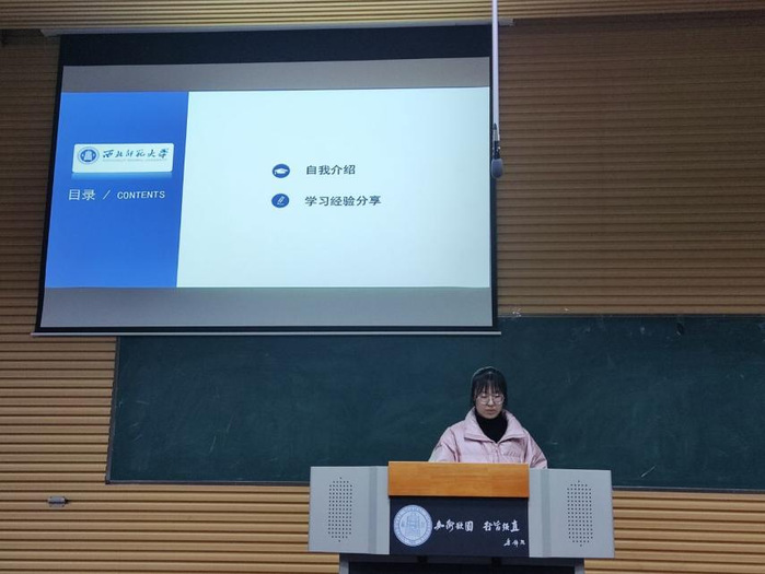 糟杰讲述了在大学期间跟随老师做科研项目,积极发表论文的经历,提醒同学们要充实自己;王晓倩讲述了自己丰富的大学生活和保研途径,鼓励同学们不负韶华、努力奋斗;武亚娟通过学习方法和经验分享,提醒同学们一定要找到适合自己的学习方法;刘明霞建议同学们注重大学期间各类证书的获取,多参加夏令营,多参与科研创新活动;鲁敏从学业考试和获奖经历方面鼓励同学们要潜心学习,丰富自我;杨旭提倡走出宿舍,走进校园,结合个人发展,做好英语学习;李月分享了双创项目参与情况和实习经历,鼓励大家勇敢尝试,积极实践。