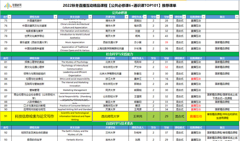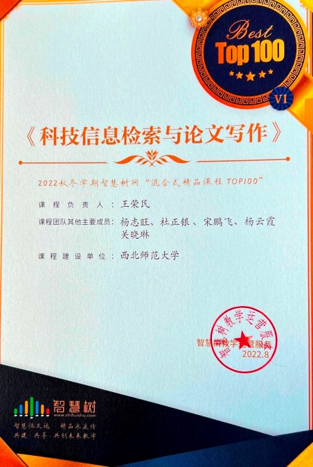 王荣民教授课程团队负责的《科技信息检索与论文写作》在线课程,从智慧树平台全国运行的1.2万门在线课程中脱颖而出,入选2022秋冬学期智慧树网“混合式精品课程TOP100”。这是我校首次入选的在线课程,也是我省入选的第二门在线课程。