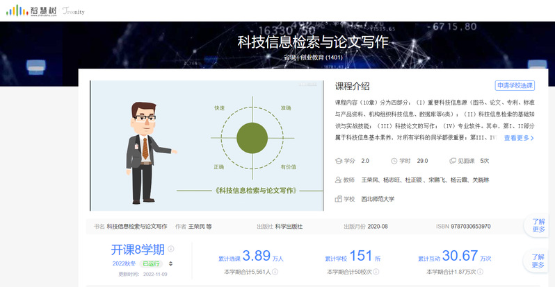 该课程自2019年9月在智慧树平台在线运行以来,深受学生与任课教师的欢迎,已累计有151所学校的3.89万名学生在线学习,累计互动30.67万次。此次,《科技信息检索与论文写作》课程入选“混合式精品课程TOP100”,是学校精品在线课程长期建设和发展的结果,将推动我校优质课程建设迈上新台阶。