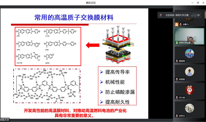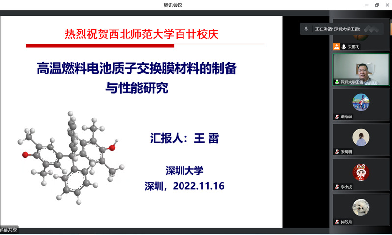 为庆祝德赢vwin体育官网120周年校庆暨德赢vwin体育官网学术月活动,应德赢vwin体育官网、保水化学功能材料甘肃省国际科技合作基地、生态功能高分子材料教育部重点实验室和甘肃省高分子材料重点实验室邀请,深圳大学王雷教授于11月16日下午通过线上会议为德赢师生作学术报告,报告题目为《高温燃料电池质子交换膜的制备与性能研究》,报告会由德赢vwin体育官网宋鹏飞教授主持,学院师生近150余人线上参加了报告会。