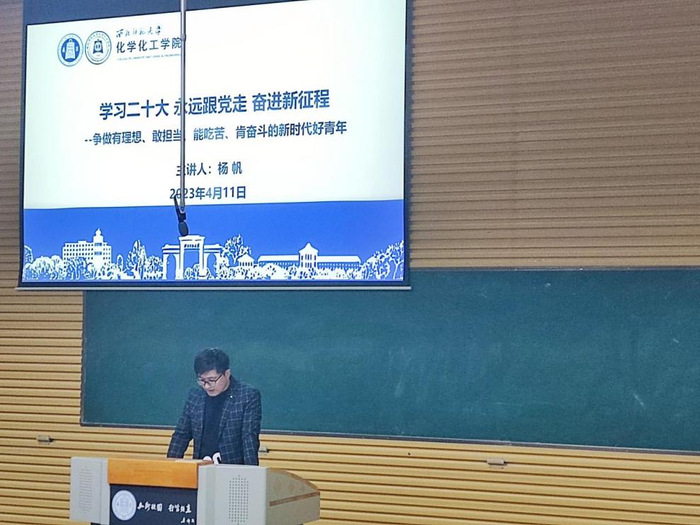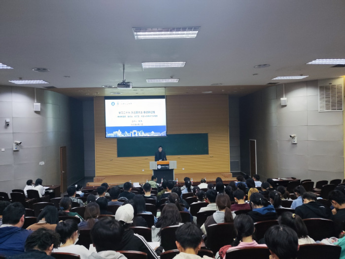 为深入贯彻学习党的二十大精神,落实“三抓三促”行动,提升学生的综合素养,学院于2023年4月11日晚,在新校区毅然报告一厅开展团委书记讲团课暨团员轮训活动,本次团课由团委书记杨帆老师主讲,辅导员梁丽洁老师、徐召老师、2022级学生及学生会成员参加。