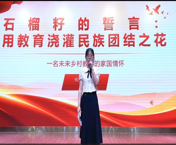 学院线上举办“石榴杯·铸牢中华民族共同体意识”主题演讲比赛,通过学生参与比赛的方式,讲好民族团结故事,构筑中华民族共有精神家园。经过激烈角逐,韩婷同学脱颖而出,她结合家族故事,誓言要“成为一名人民教师,做一颗永不褪色的石榴籽,用化学方程式续写民族团结新篇章”。